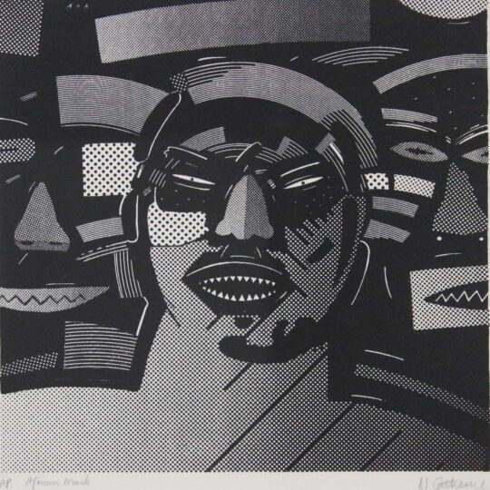 African Mask. Screenprint on Paper, 25cm x 25cm excluding frame, 51cm x 41cm including frame. Framed.