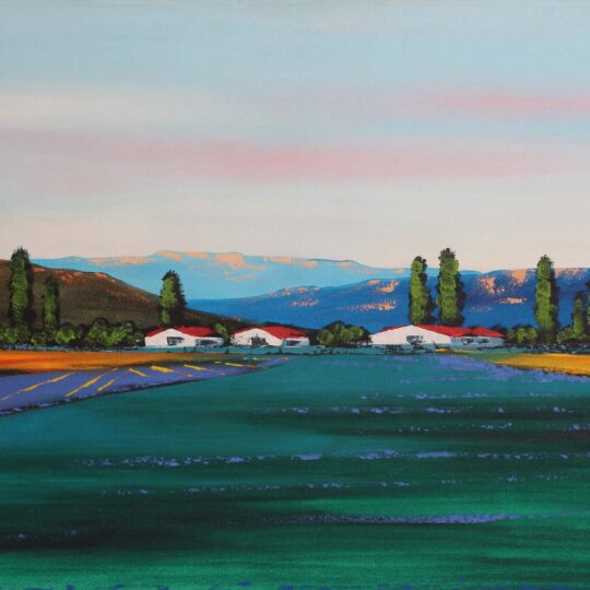 Landscape with Houses. Oil on Canvas 80cm x 120cm excluding frame, 106cm x 145cm including frame. Framed.