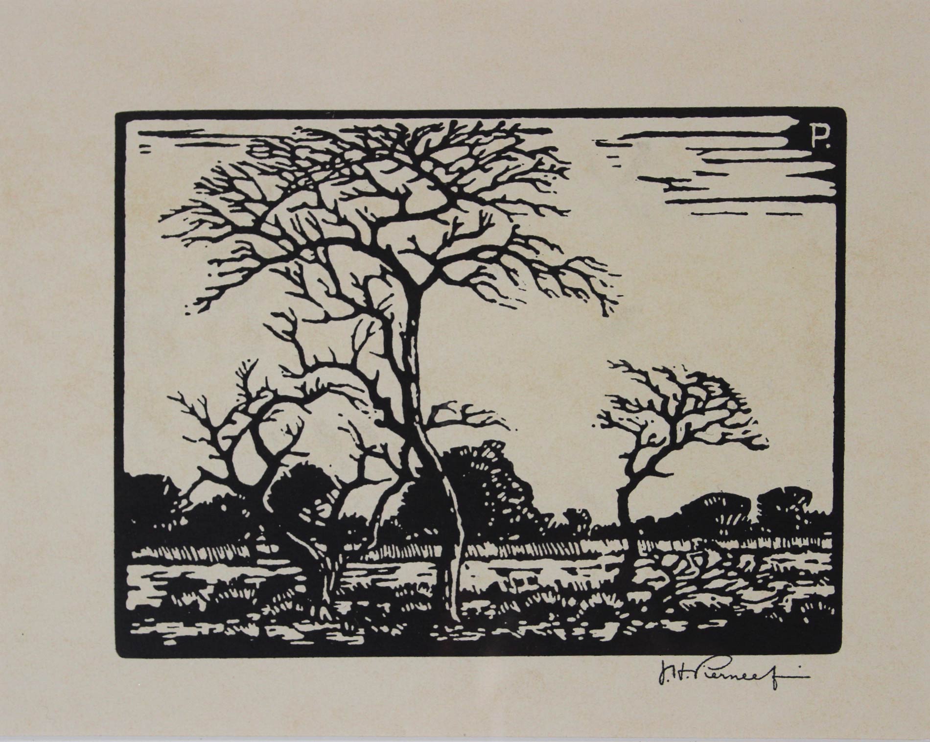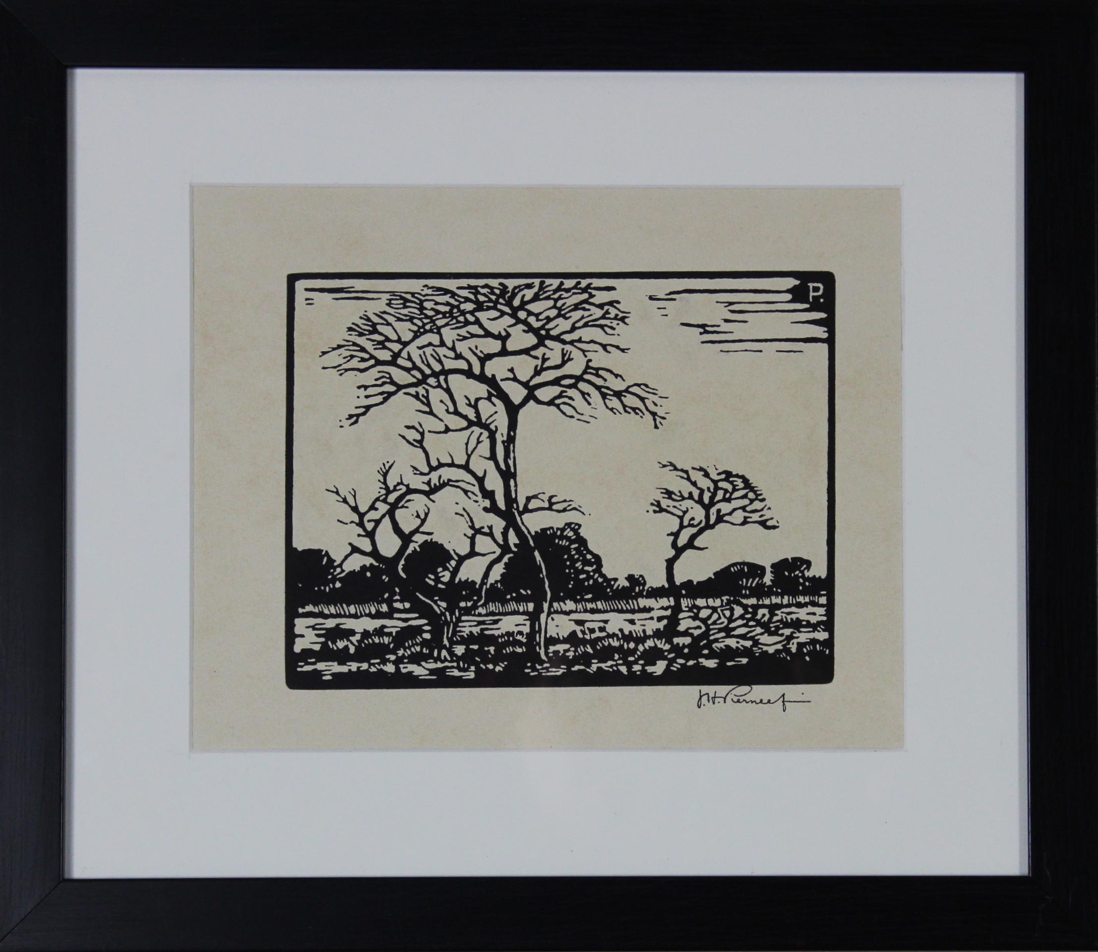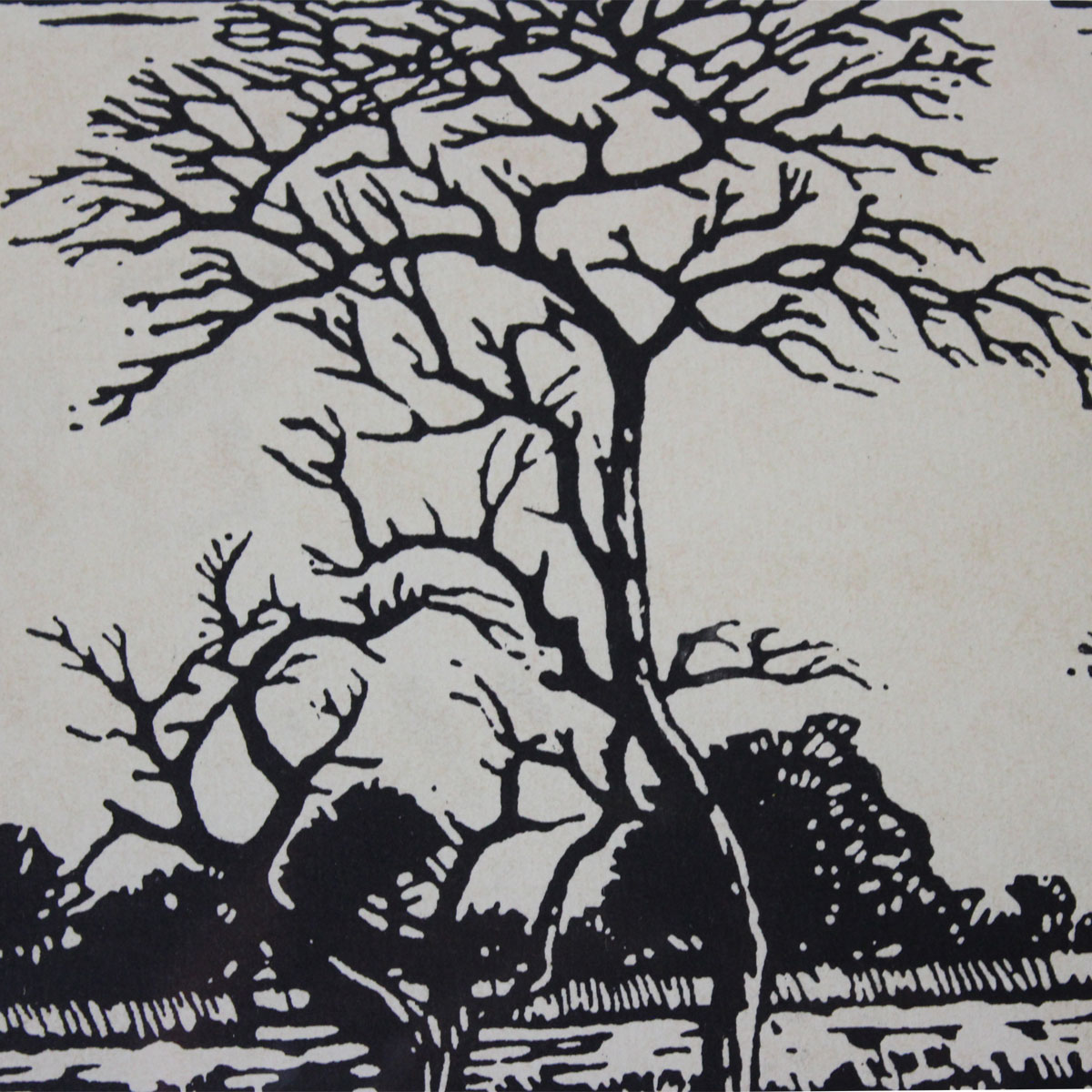 Doringboom in Veldlandskap. Linocut on Paper, 16,5cm x 22cm image size, 38cm x 44cm including frame. Framed.