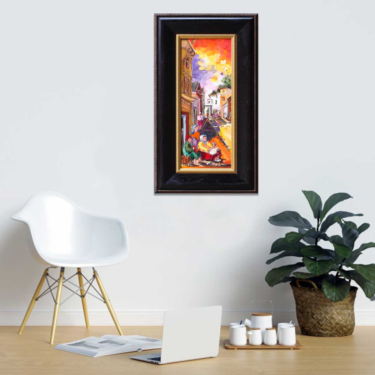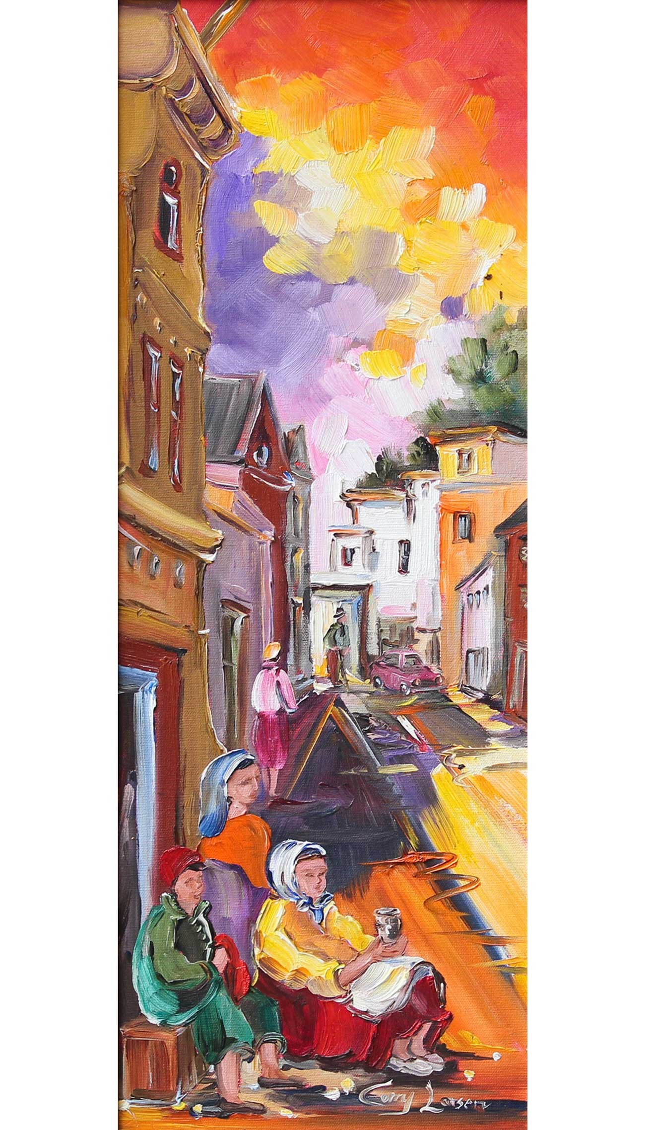 Street Scene. Oil on Canvas on Board, 61cm x 23cm excluding frame, 83cm x 45cm including frame. Framed.