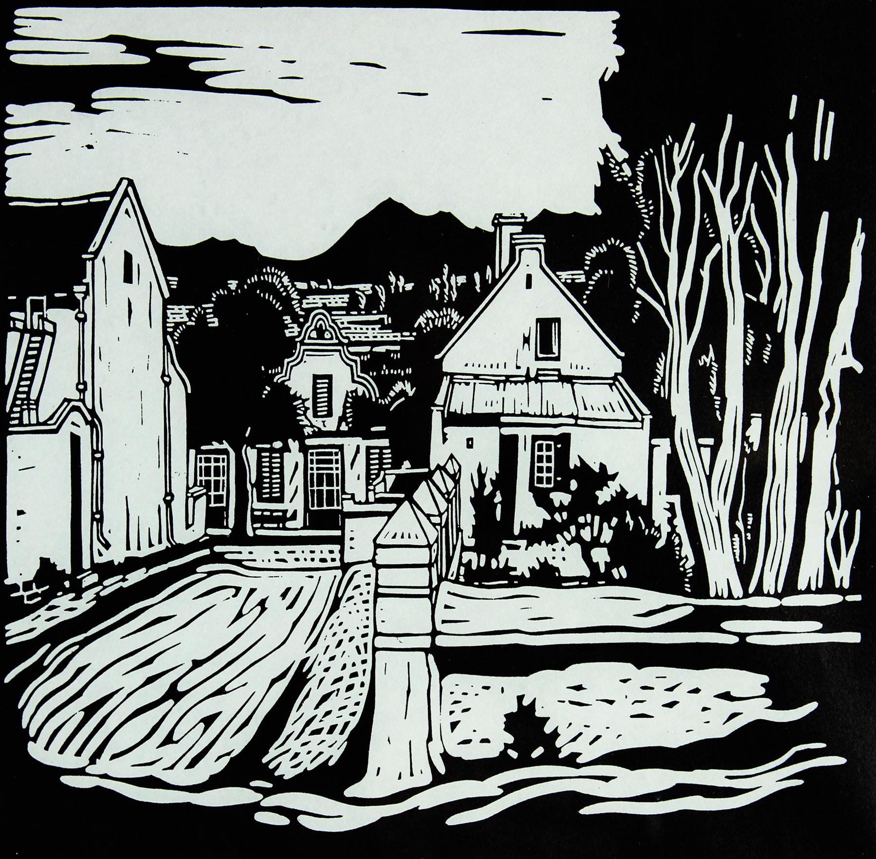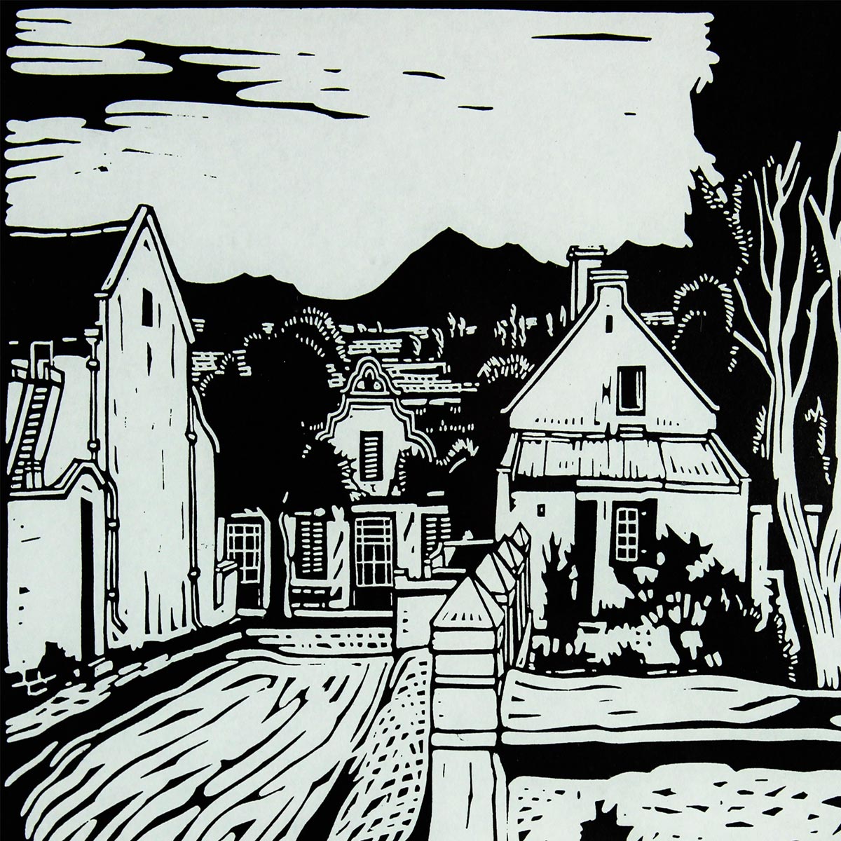 Bezuidenhout Valley. Etching on Paper, 7cm x 12.5cm image size, 29.5cm x 40.5cm including frame. Framed.