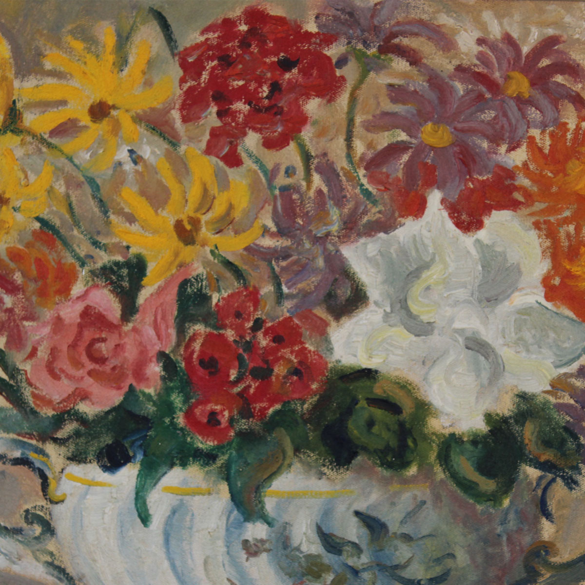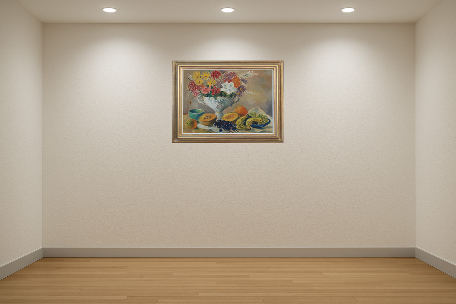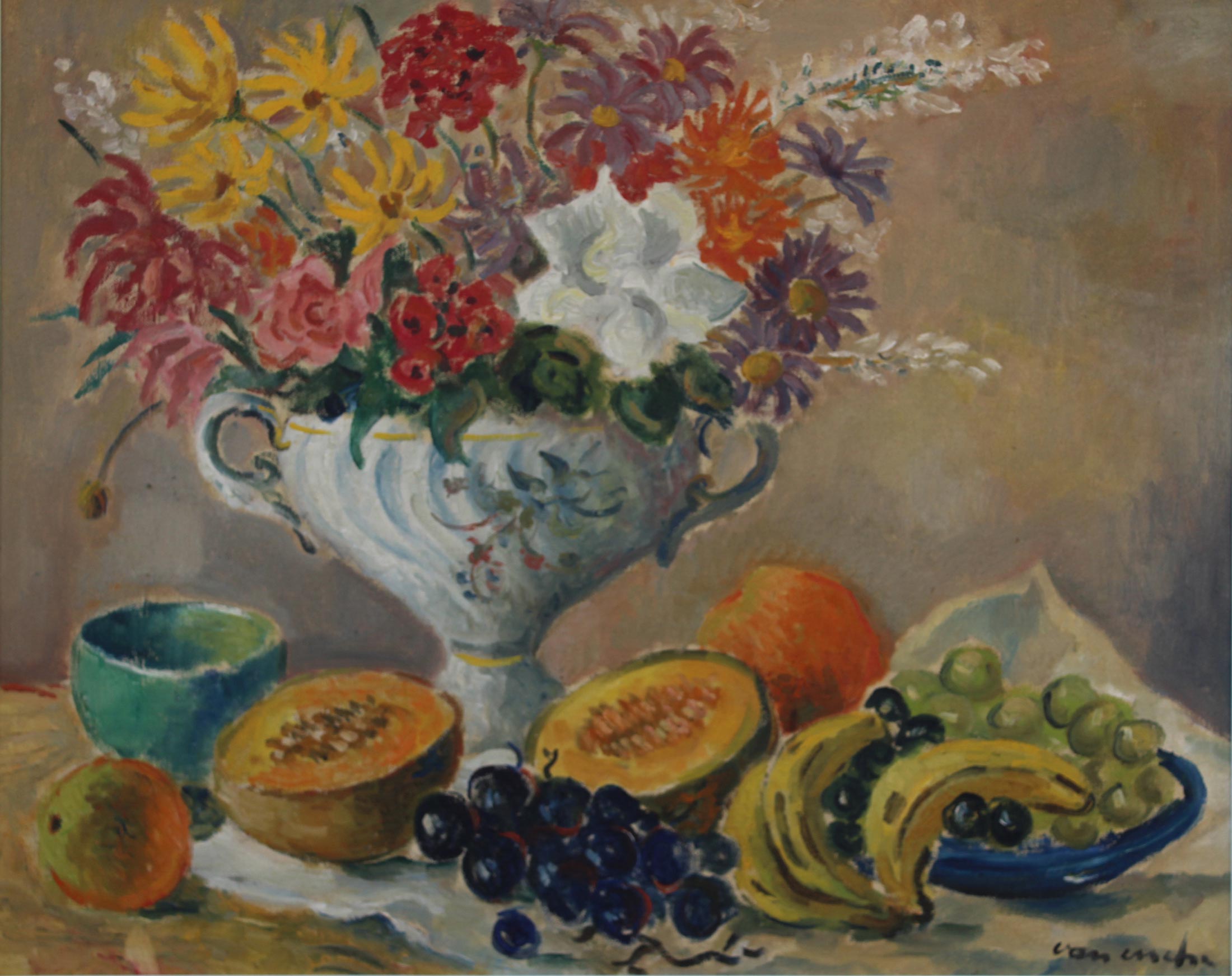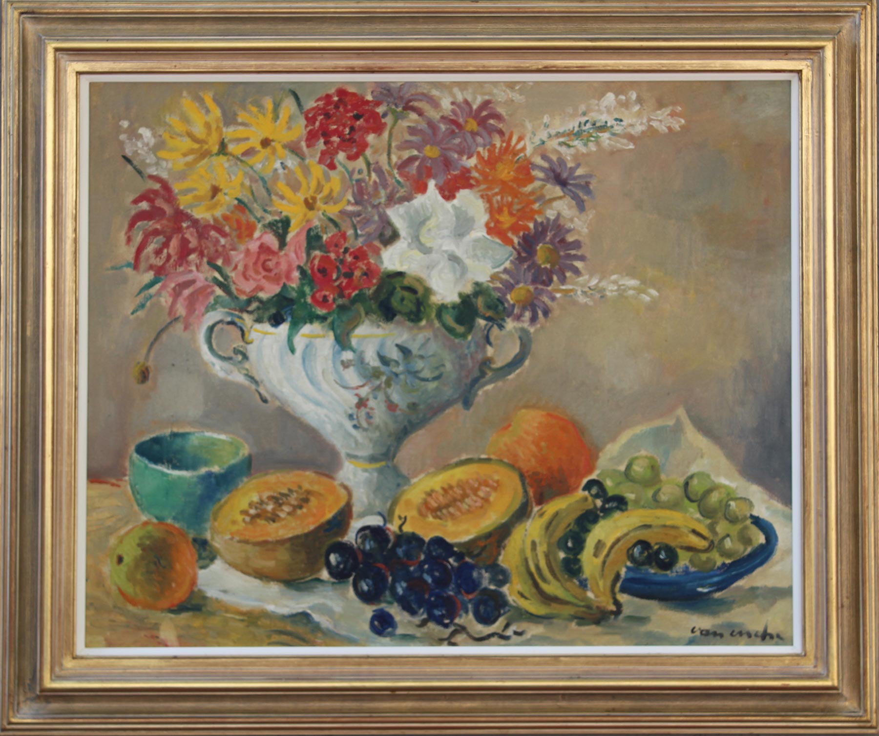 Still Life with Flowers and Fruit. Oil on Canvas, 60cm x 75cm excluding frame, 75,5cm x 90,5cm including frame. Framed.