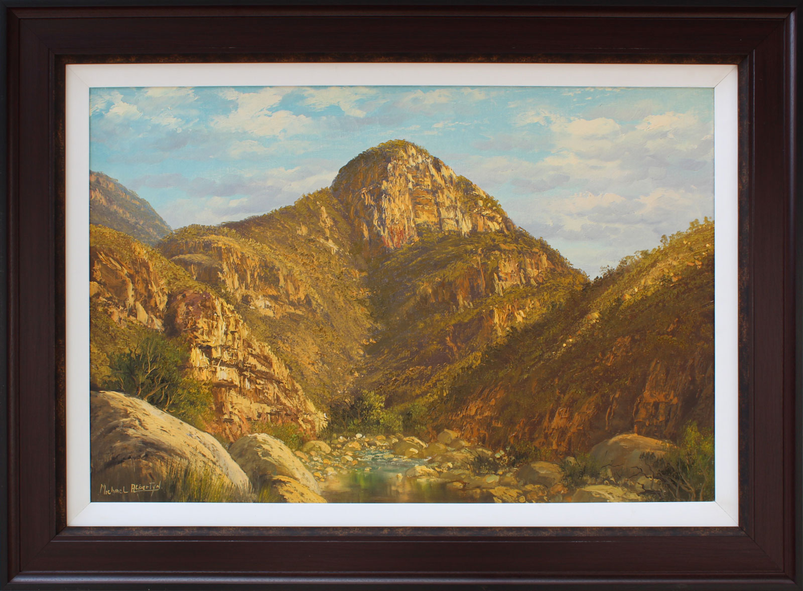 Landscape with Mountains. Oil on Canvas, 60cm x 91cm excluding frame, 76.5cm x 107cm including frame. Framed.