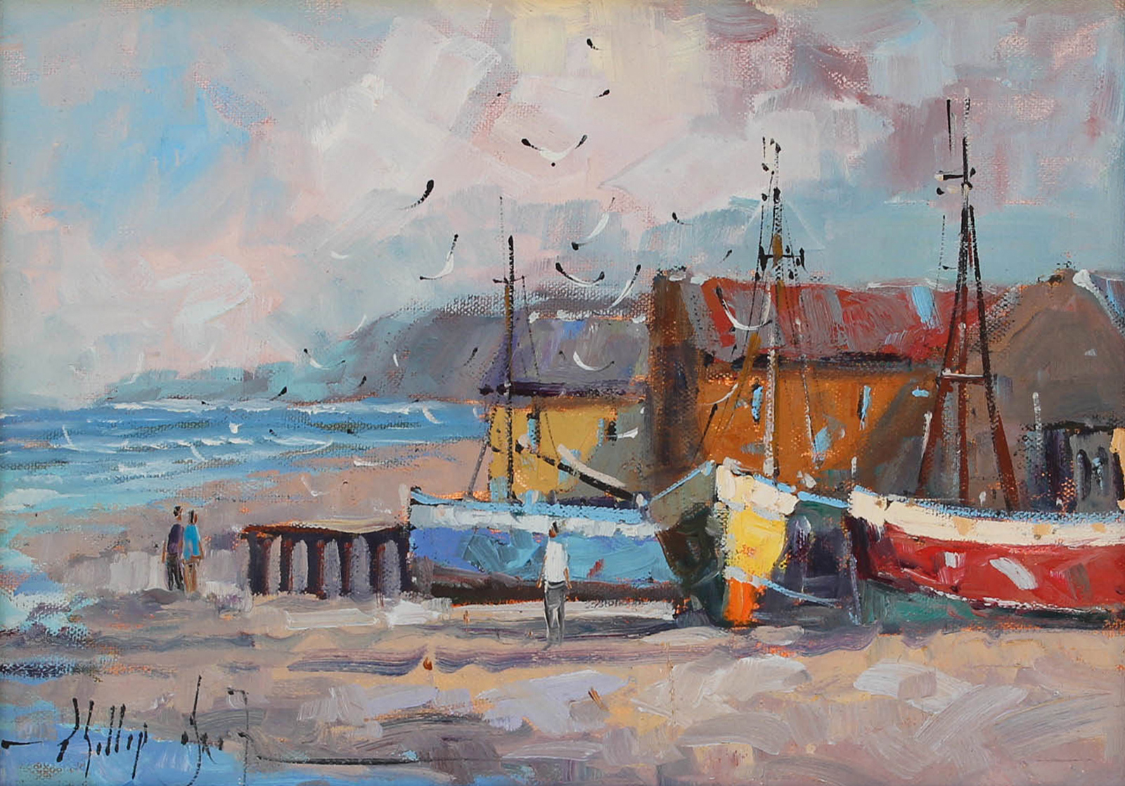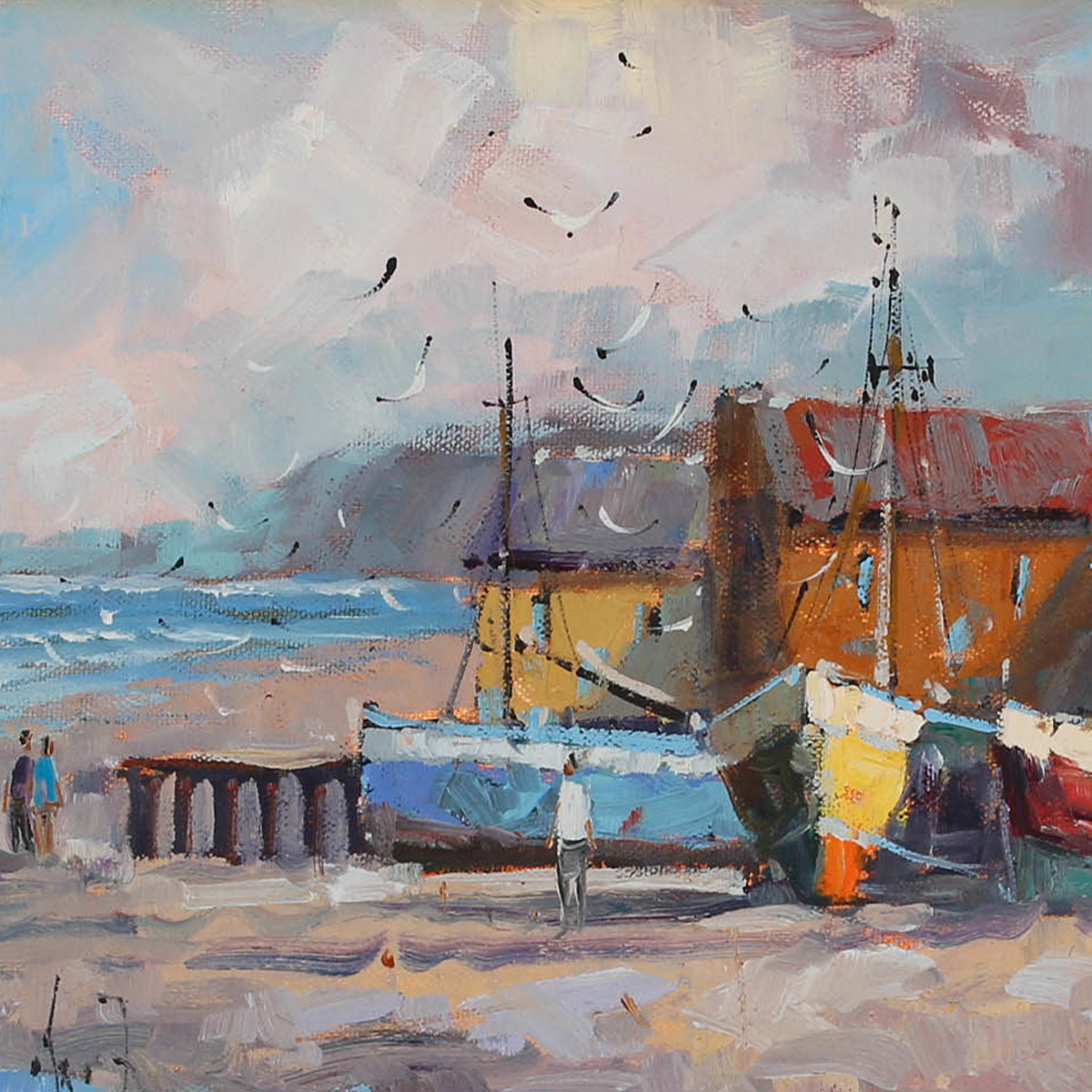 A Day at the Beach. Oil on Board 60cm x 90cm excluding frame, 86cm x 116cm including frame. Framed.