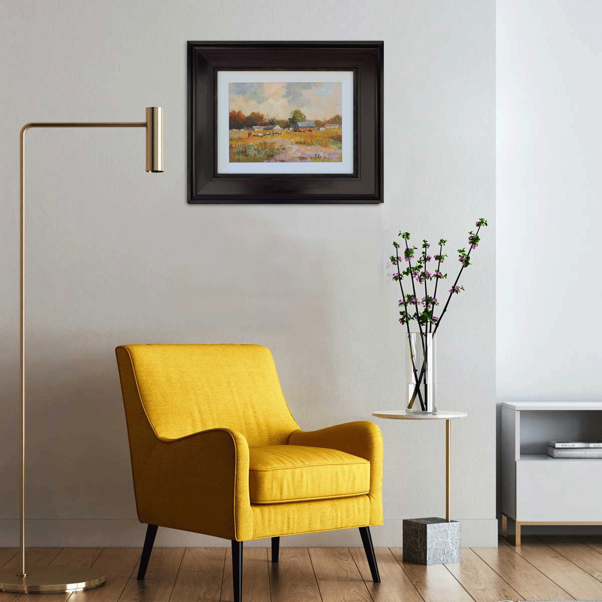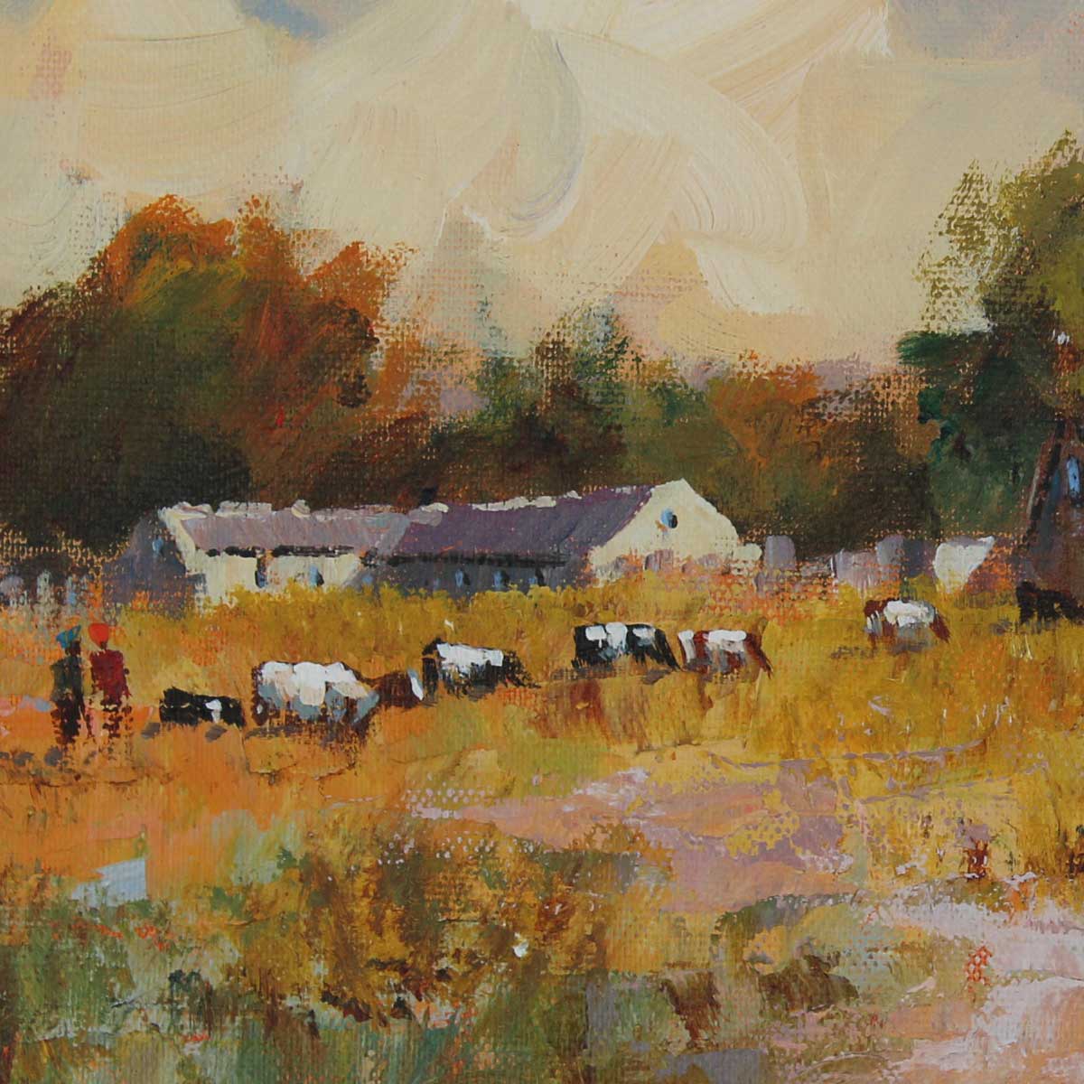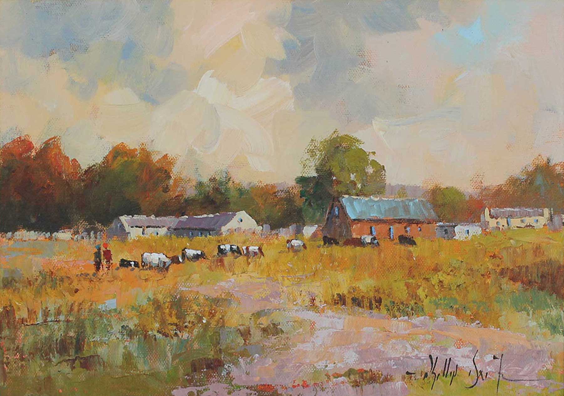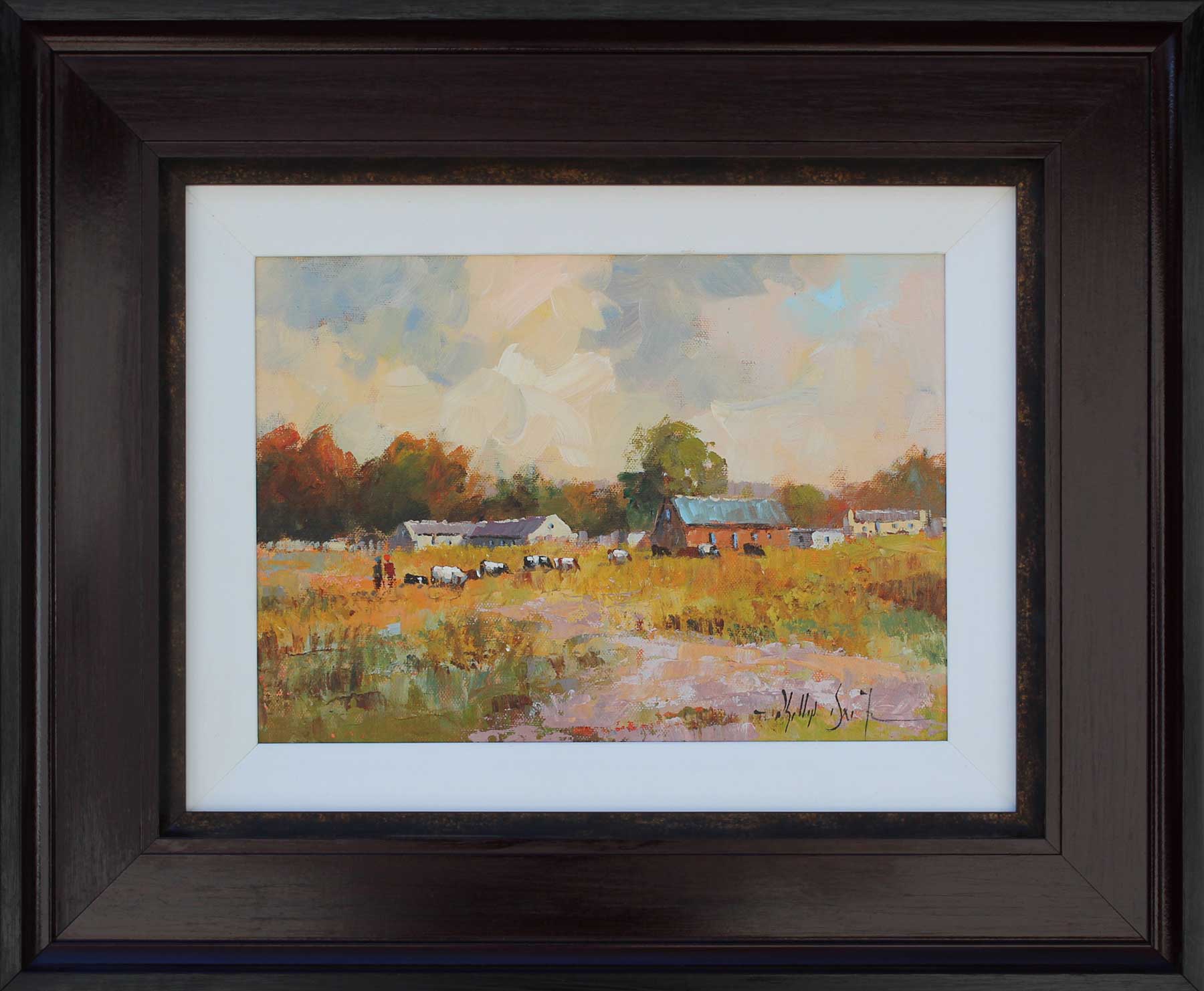 Farmhouse with Cattle. Oil on Board 25cm x 35cm excluding frame, 50cm x 60cm including frame. Framed.