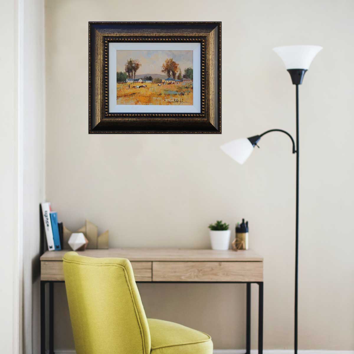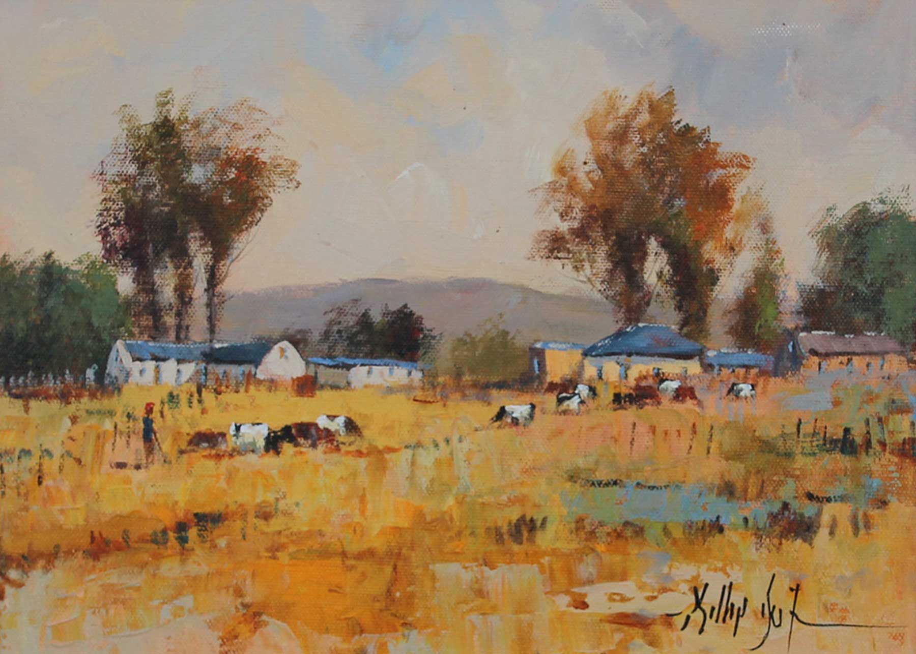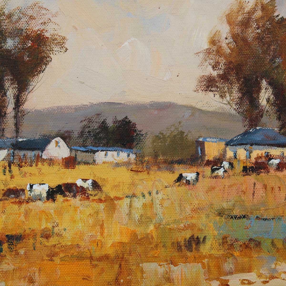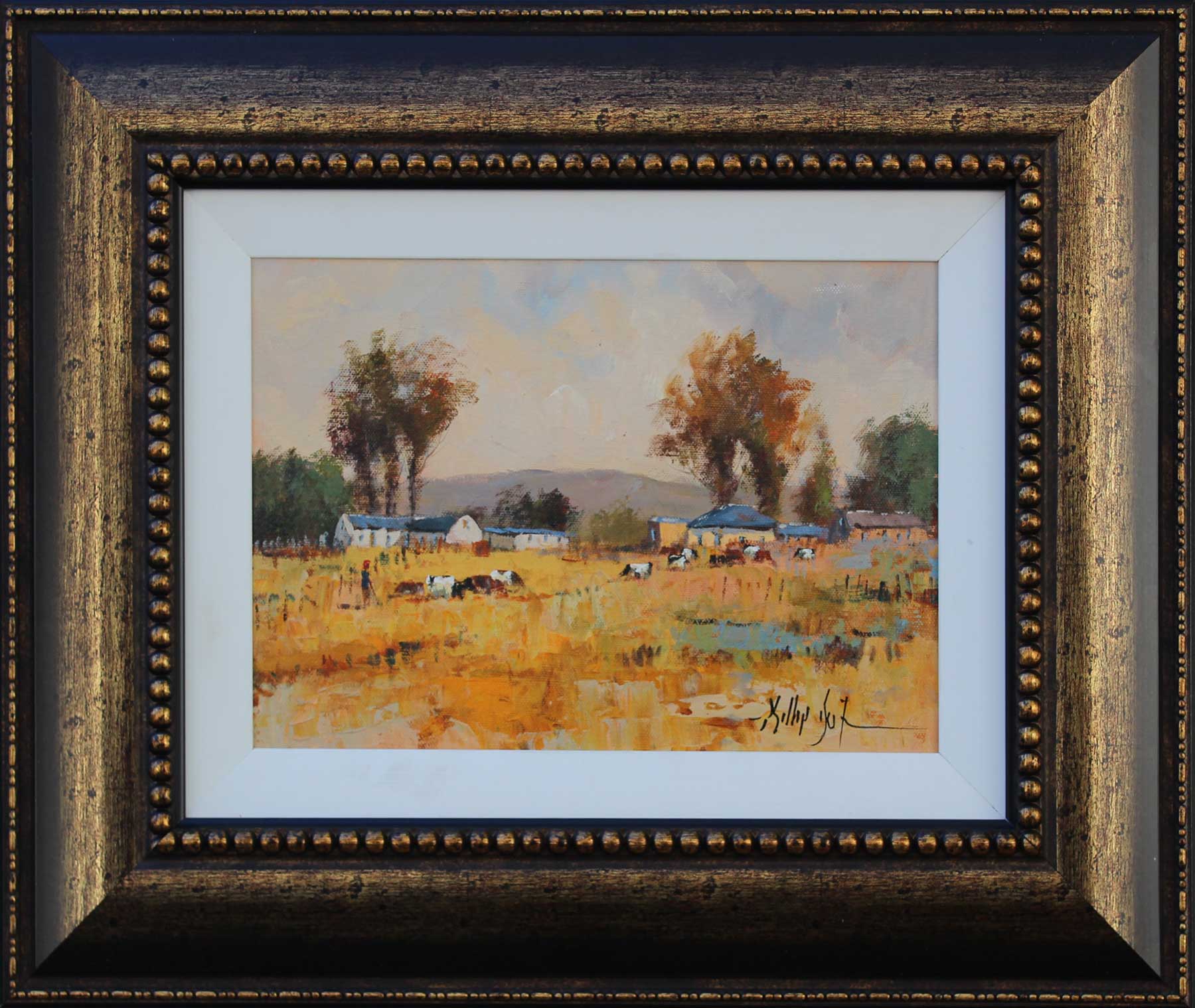 Farmhouse with Cattle. Oil on Board, 25cm x 35cm excluding frame, 49.5cm x 59.5cm including frame. Framed.
