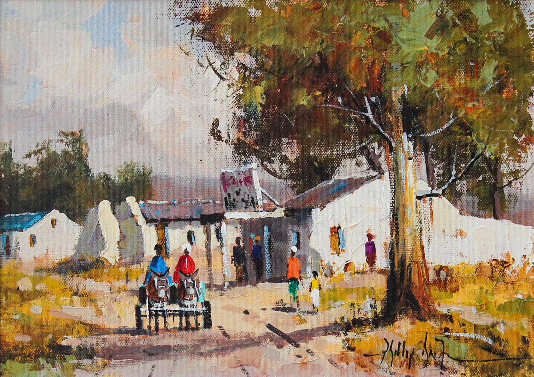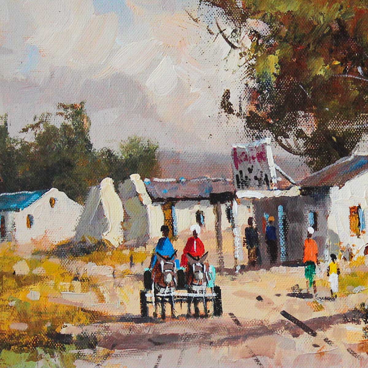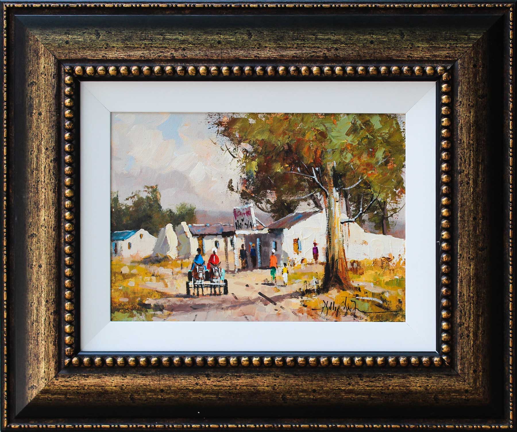 Village Scene with Donkey Cart. Oil on Board 25cm x 35cm excluding frame, 49.5cm x 59.5cm including frame. Framed.