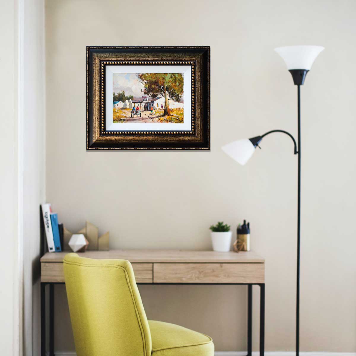Labourer’s Cottages. Oil on Board, 45cm x 60cm excluding frame, 69.5cm x 84.5cm including frame. Framed.