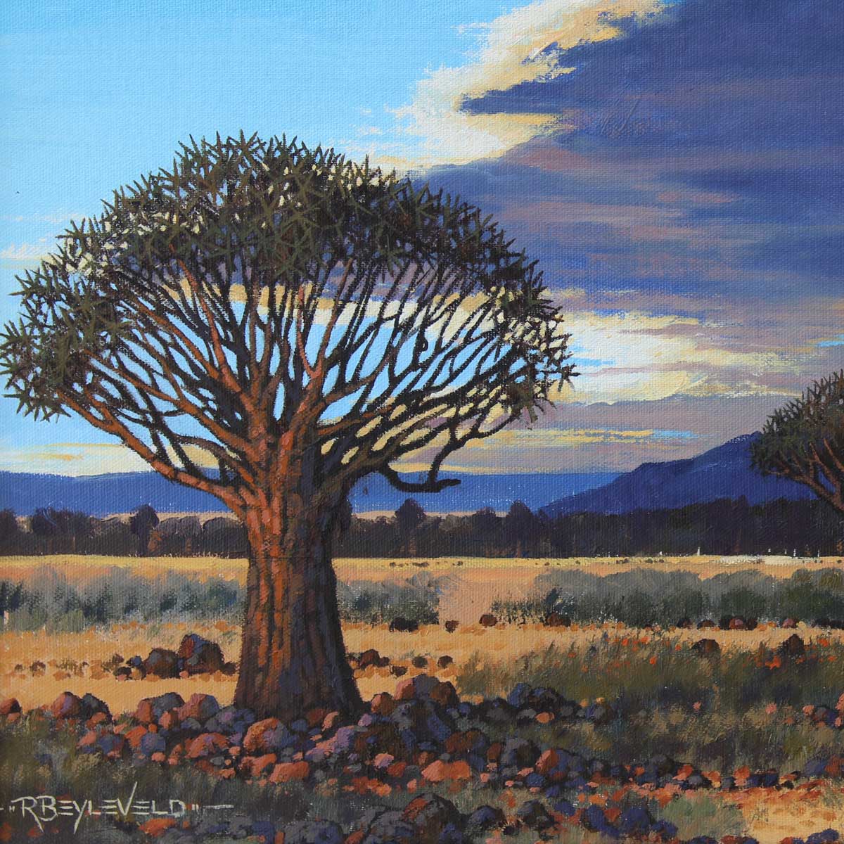 Quiver Trees. Oil on Canvas on Board, 45cm x 60cm excluding frame, 68.5cm x 83.5cm including frame. Framed.