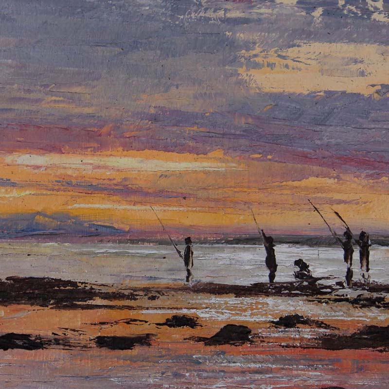 Fishermen at the Beach. Oil on board 25cm x 35cm. Framed.
