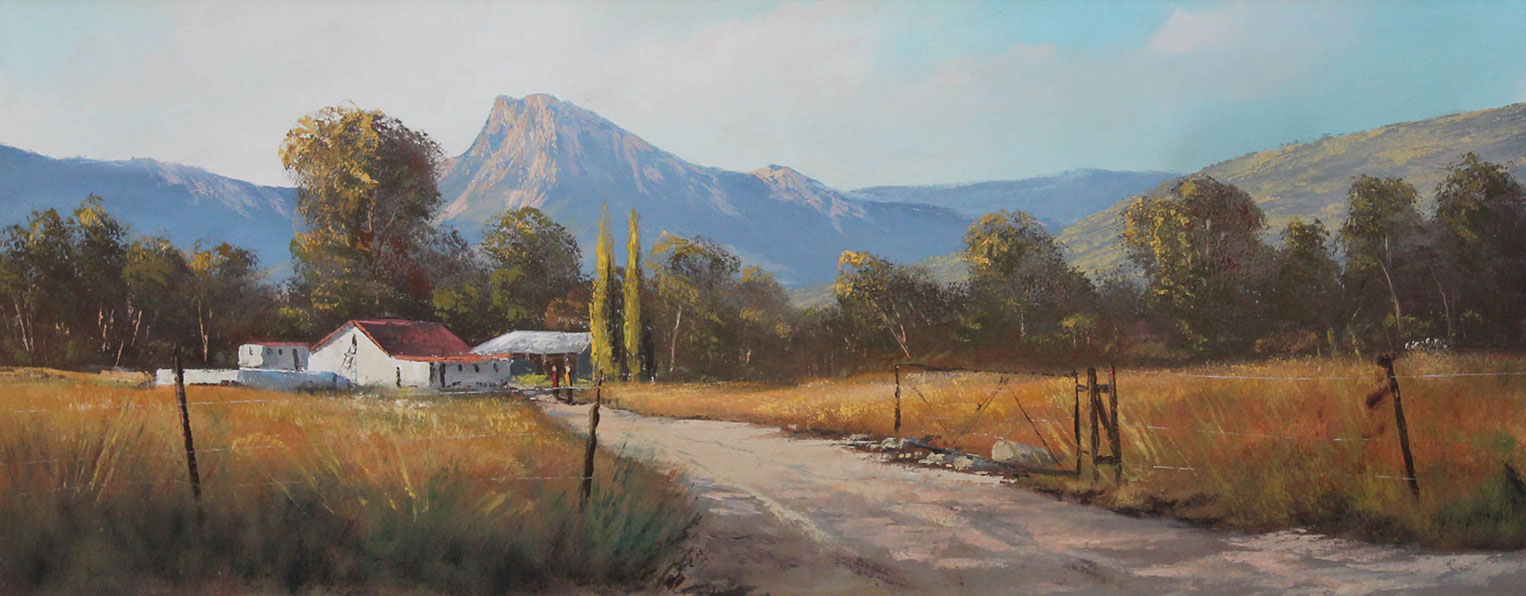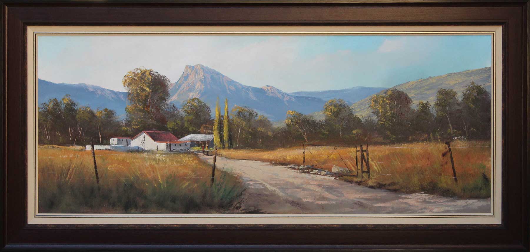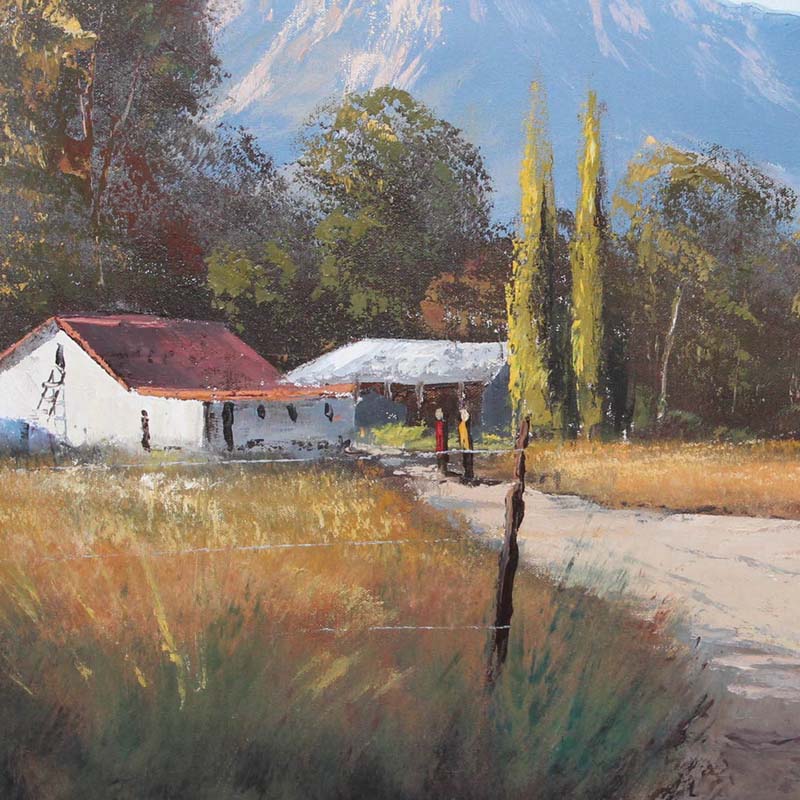Farmscape with Figures. Oil on canvas on board 60cm x 150cm. Framed.